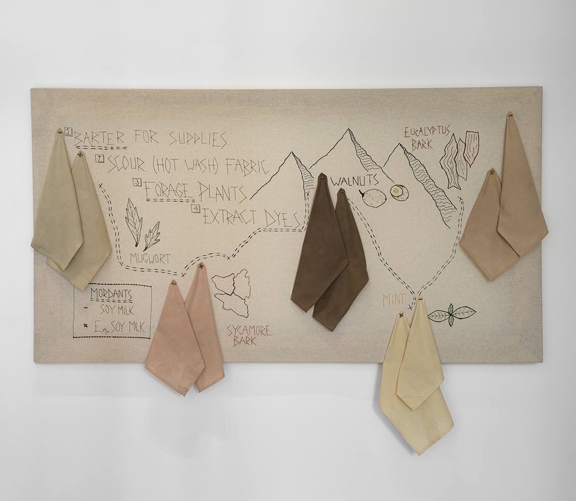 Natural dyes were obtained for this work through foraging for plants in the Angeles National Forest. Presented is the artist’s research come to life as a layout sketch in thread, cotton, and bronze. All materials used were either obtained through bartering or purchased from small businesses.